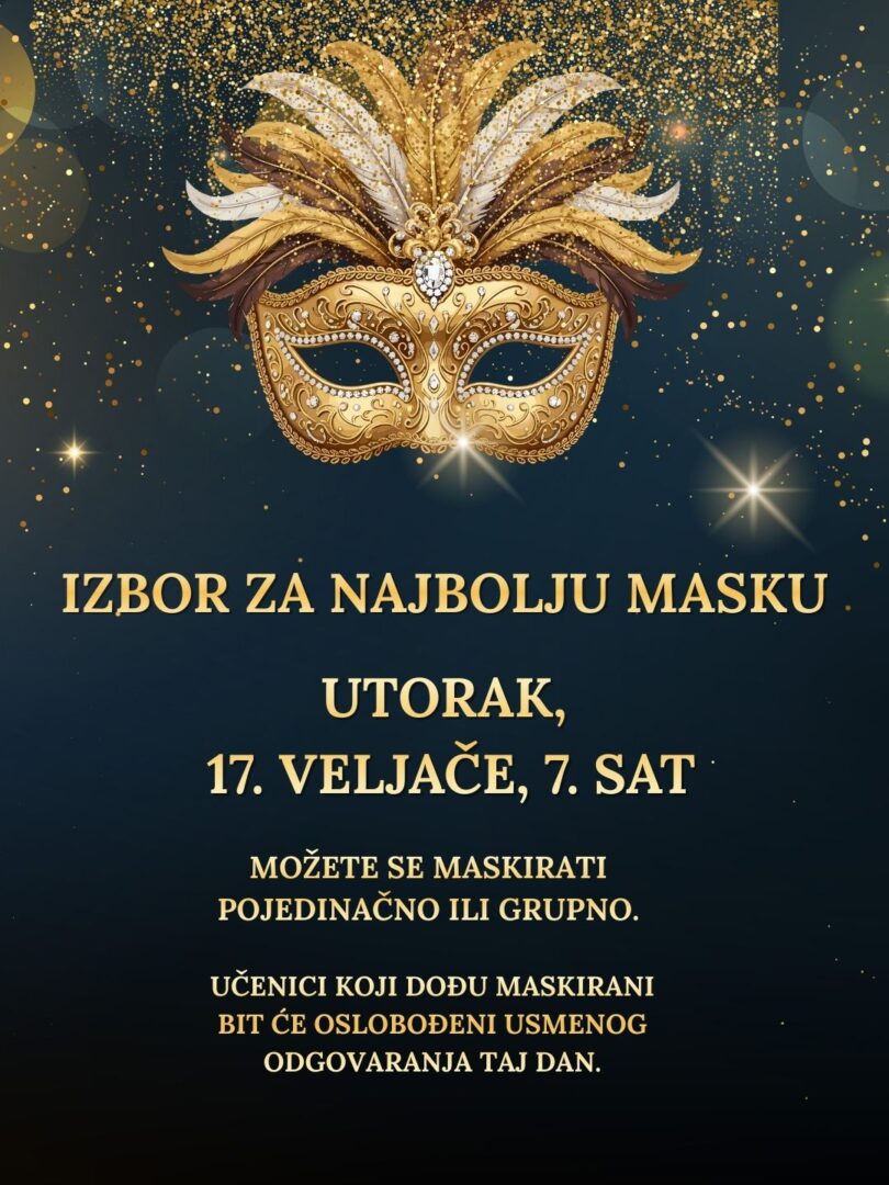 Izbor za najbolju masku održat će se u utorak, 17. veljače, 7. sat. Možete se maskirati pojedinačno ili grupno. Učenici koji dođu maskirani bit će oslobođeni usmenog odgovaranja taj dan.