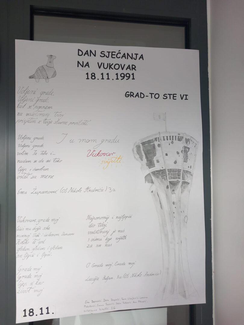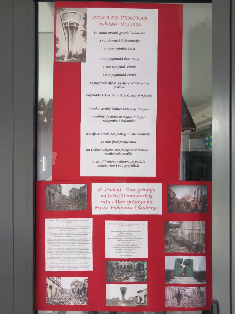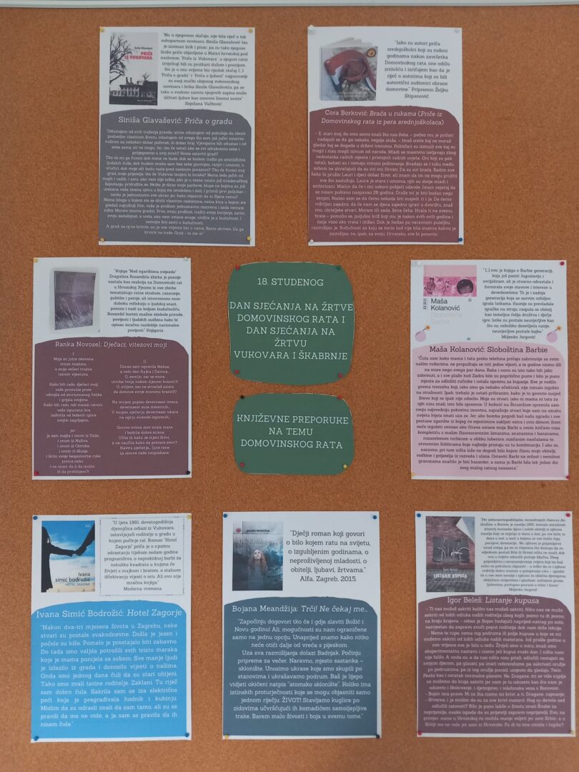 Učenici 3. G razreda sa školskom knjižničarkom razgovarali su na satu razrednika o Danu sjećanja, Domovinskom ratu, današnjoj situaciji u zemlji i čitali ulomke iz književnih djela na temu Domovinskog rata poput Listanja kupusa Igora Beleša, Sloboštine Barbie Maše Kolanović i Hotela Zagorje Ivane Bodrožić. Ispred školske knjižnice i u holu škole postavljena je prigodna izložba.
